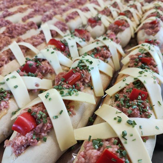 een Stokbroodje gevuld met grillworst deeg en af gegarneerd met kaas en paprika